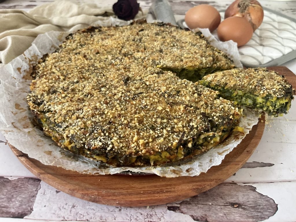 The pumpkin and Swiss chard pie without puff pastry is a savory pie made with Swiss chard, pumpkin, and rice topped with a crunchy breadcrumb surface that replaces the puff pastry.