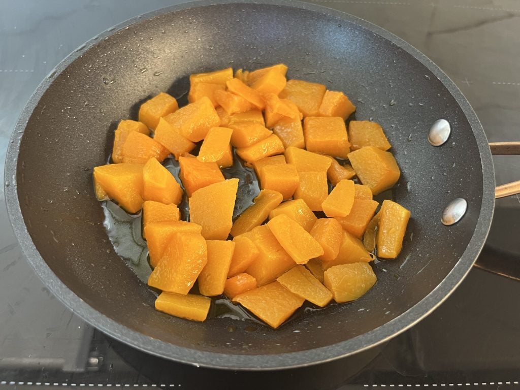 • Once browned, remove it and add the pumpkin cubes. Salt and cook for 8-10 minutes (the time varies based on the size of the pumpkin cubes) with a lid, turning them several times.