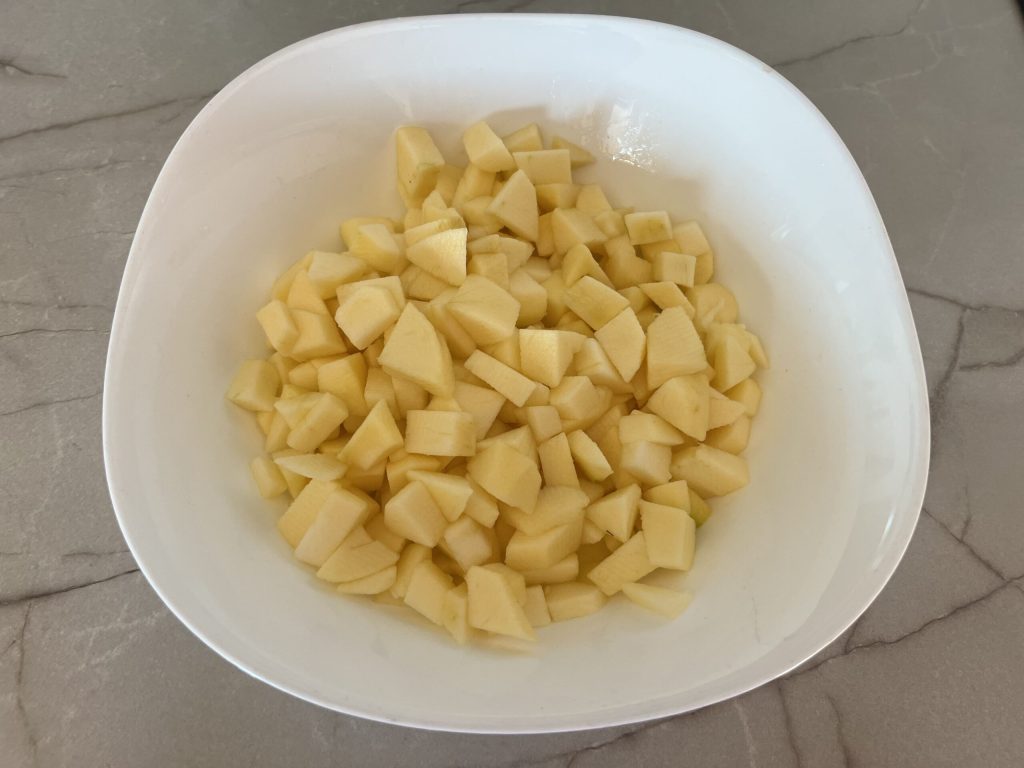 Cut into small cubes. Place them in a bowl along with the juice of one lemon. This will prevent them from browning.