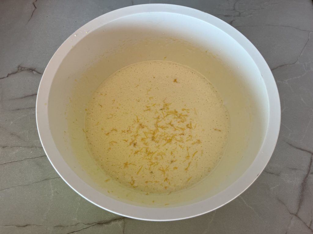 Add the grated zest of one lemon, and while keeping the electric beaters active, add the yogurt, vegetable oil, flour, and baking powder.