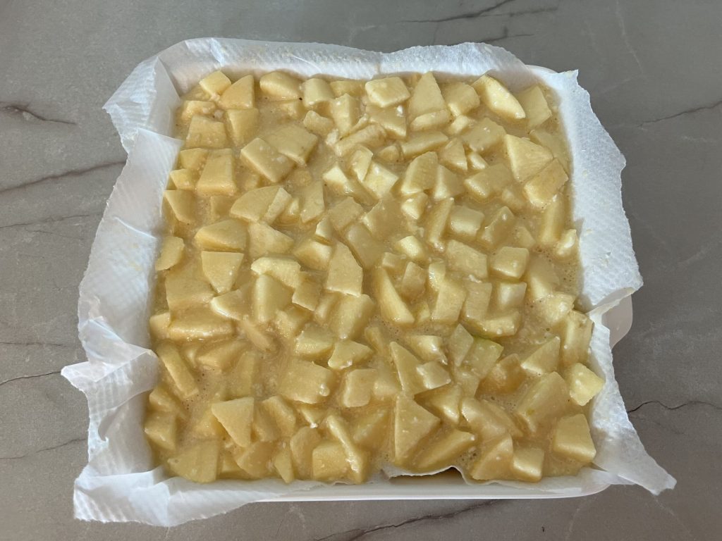 Line a baking pan, I used a 20×20 pan, with parchment paper, and pour the batter