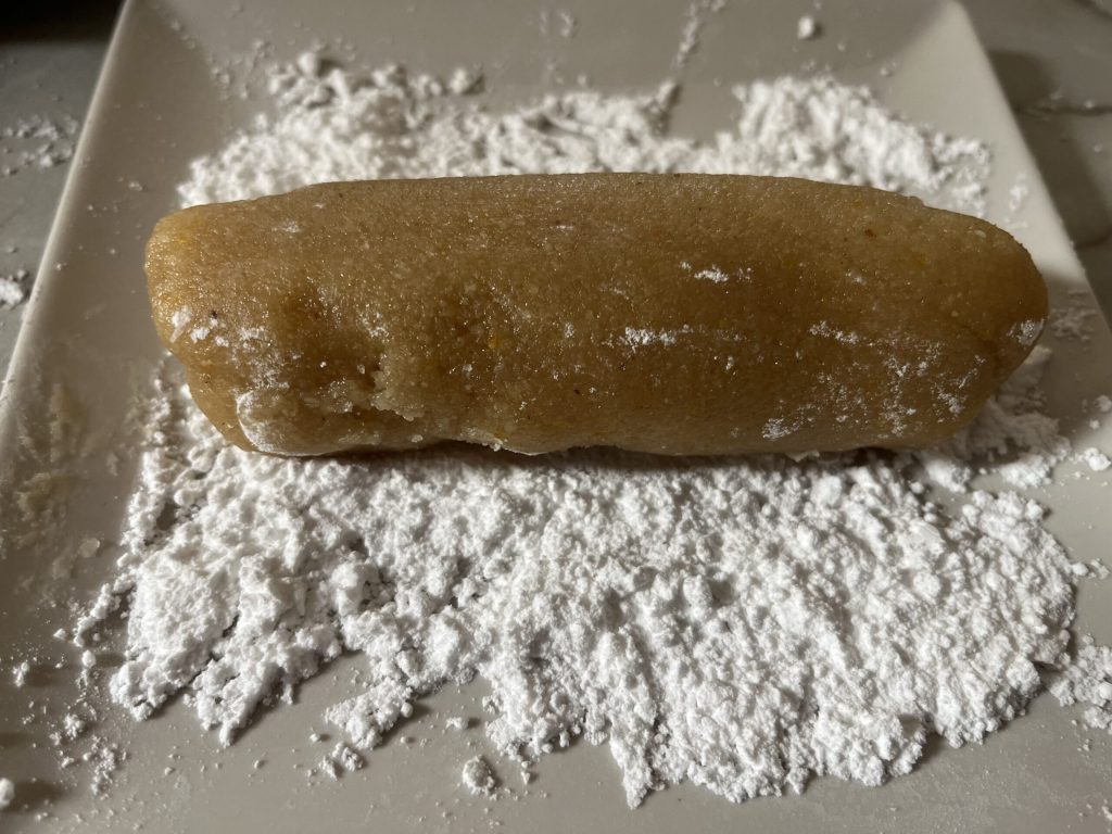 After resting, form small loaves, roll them in powdered sugar, and cut them into the classic oval shape of ricciarelli Siena