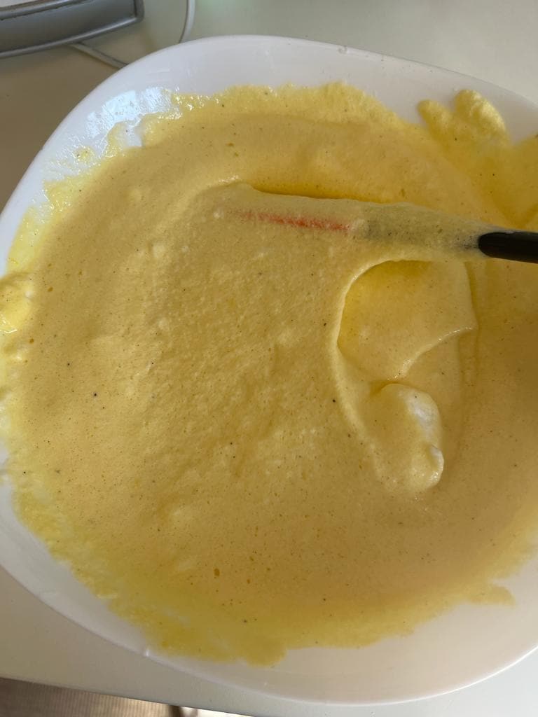 Finally, slowly fold in the stiff egg whites and gently fold from bottom to top to avoid deflating it.