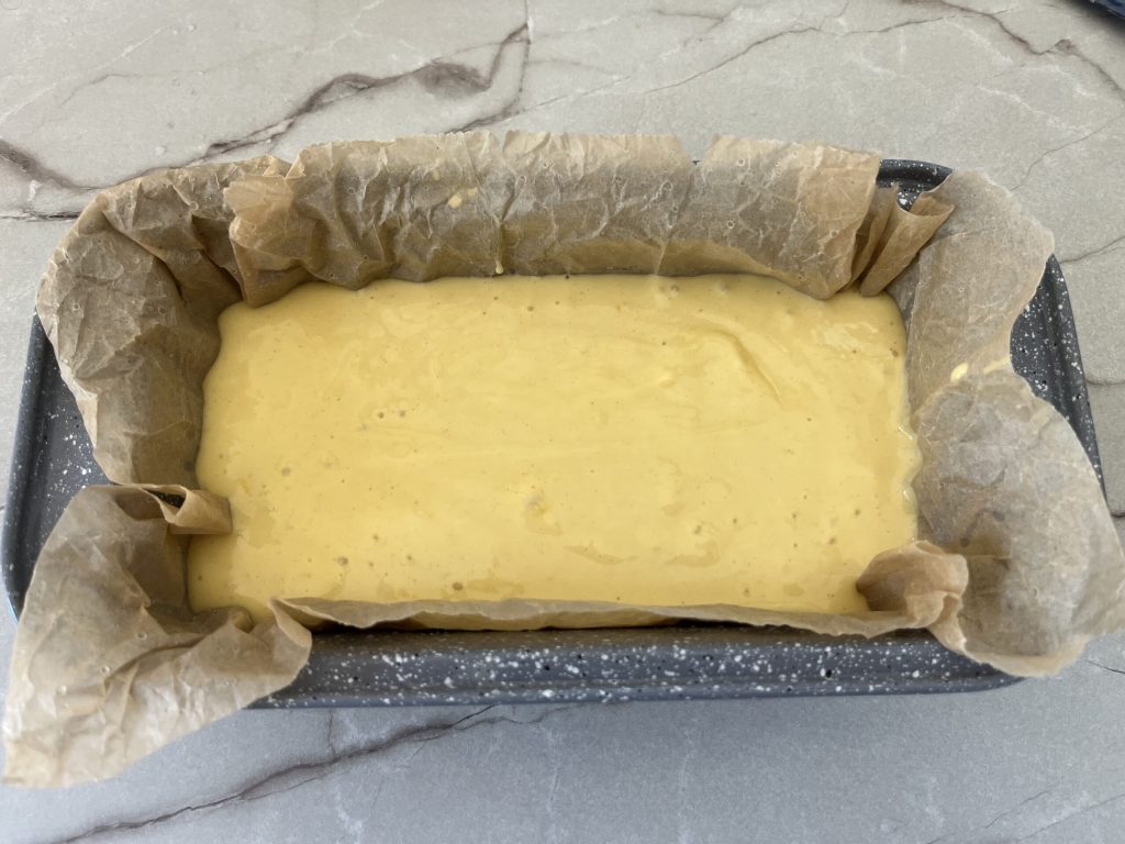 Pour into the loaf pan (10 in) lined with parchment paper or lightly greased, and level it with a kitchen spatula.