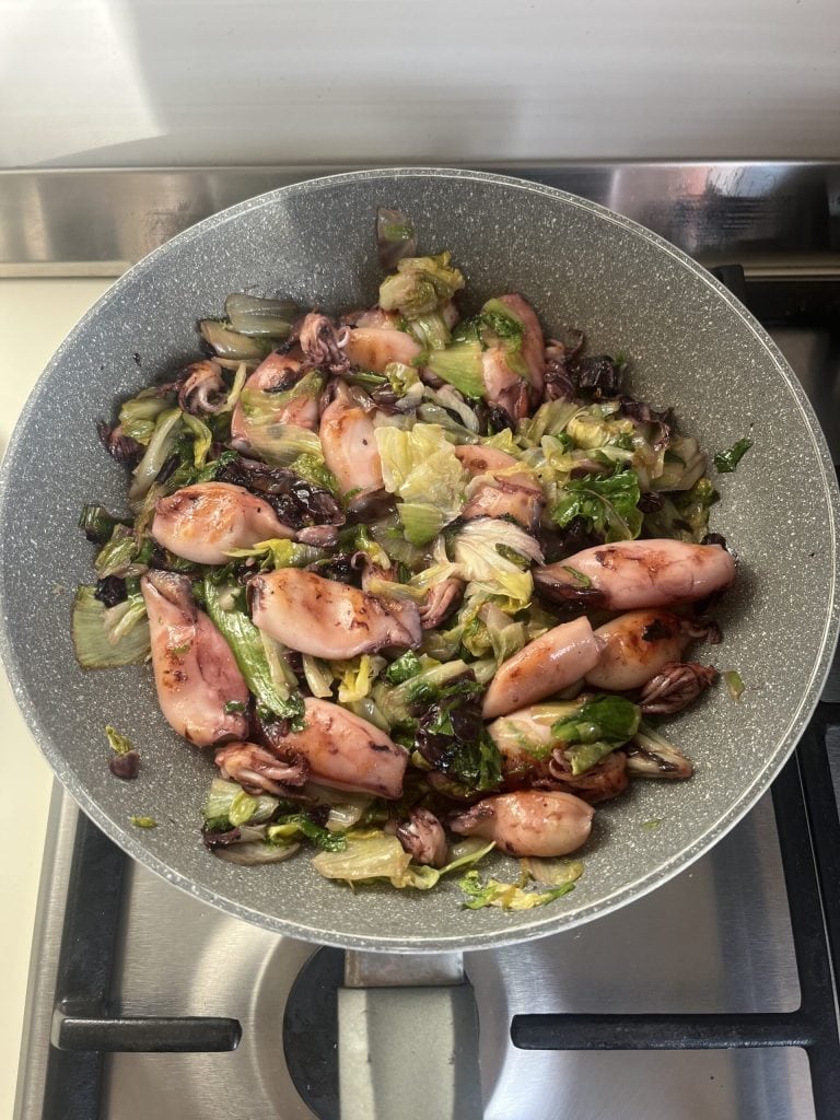 • Once both are cooked, combine the squid with the salad, mix well with the wooden spatula, and before serving, season with the previously squeezed lemon juice and a drizzle of extra virgin olive oil. Our recipe is finally ready to be served… warm in winter, and it’s also excellent cold in summer.