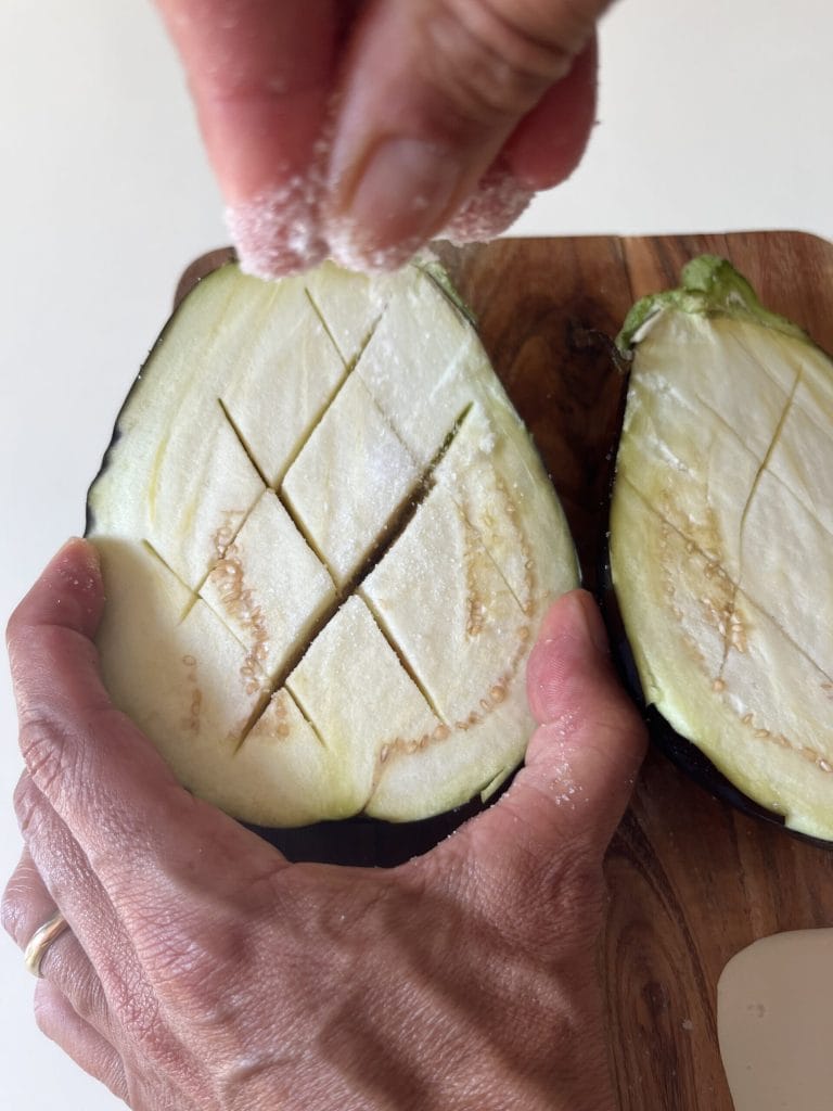 Next, take a cutting board and with a kitchen knife, halve the eggplant lengthwise. Score the flesh with crosswise cuts, as in the picture, widen the cuts with your hands and salt both inside the cracks and on the surface. After salting them, not too much, mind you, flip them over on the cutting board or on the sink countertop, and let them drain for about half an hour. After this time, dry them well with some absorbent paper.