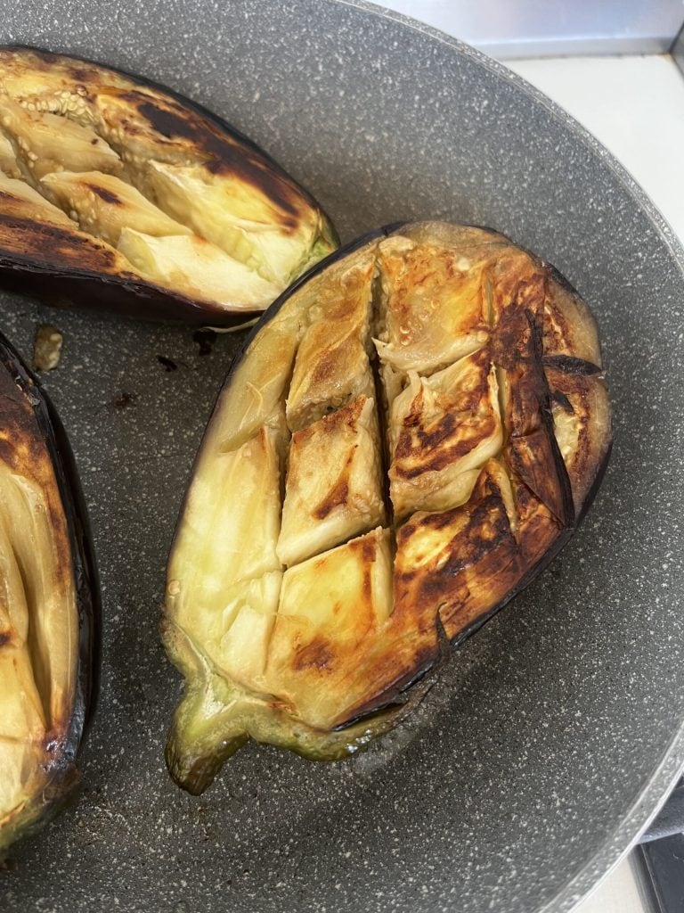 Meanwhile, take a non-stick pan, add a bit of oil and heat it. Then add the eggplants, cut side down, cover, keep the heat low, and cook for 20 minutes, turning at least once from each side. When they are almost cooked and nicely golden, mash the flesh with a fork and remove any excess seeds. This way, you’ll have space to add your filling. Then add the grated parmesan cheese