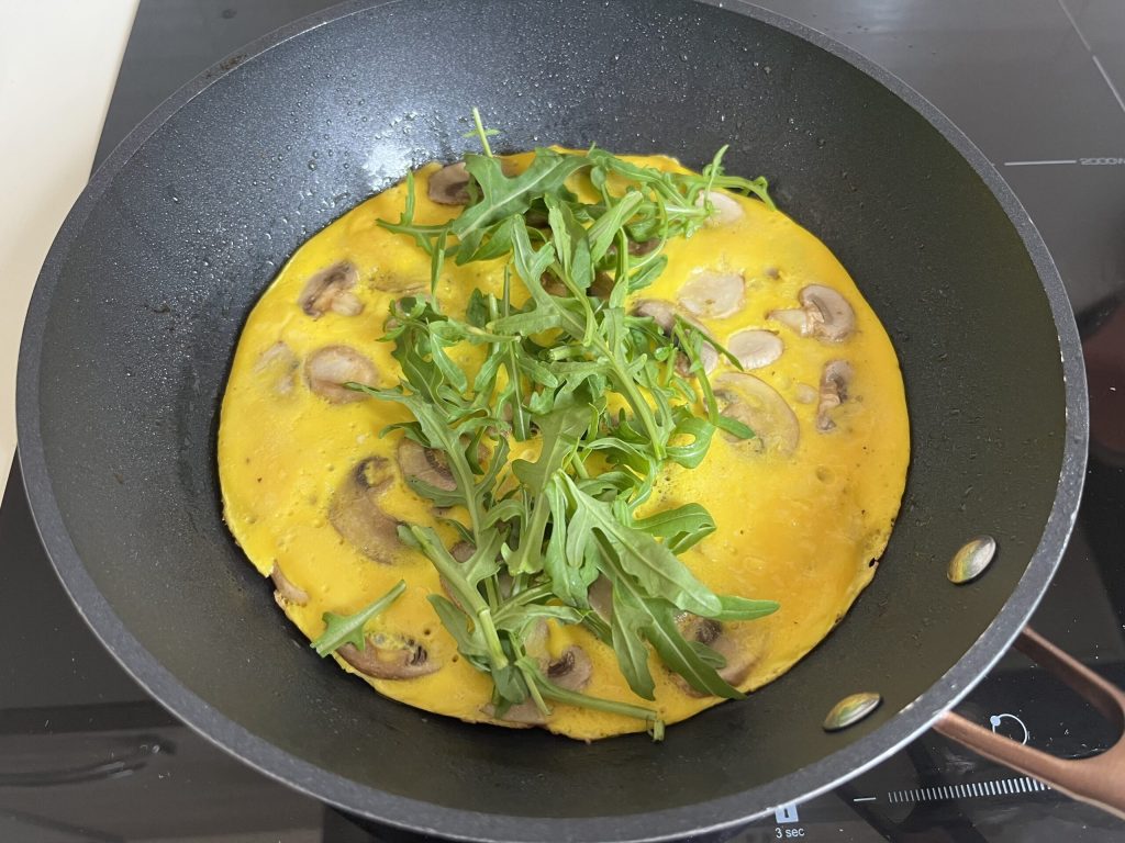 • and the cherry tomatoes cut into wedges and season with a bit of salt. Fold the outer sides to the center and the protein omelette is ready to be served!