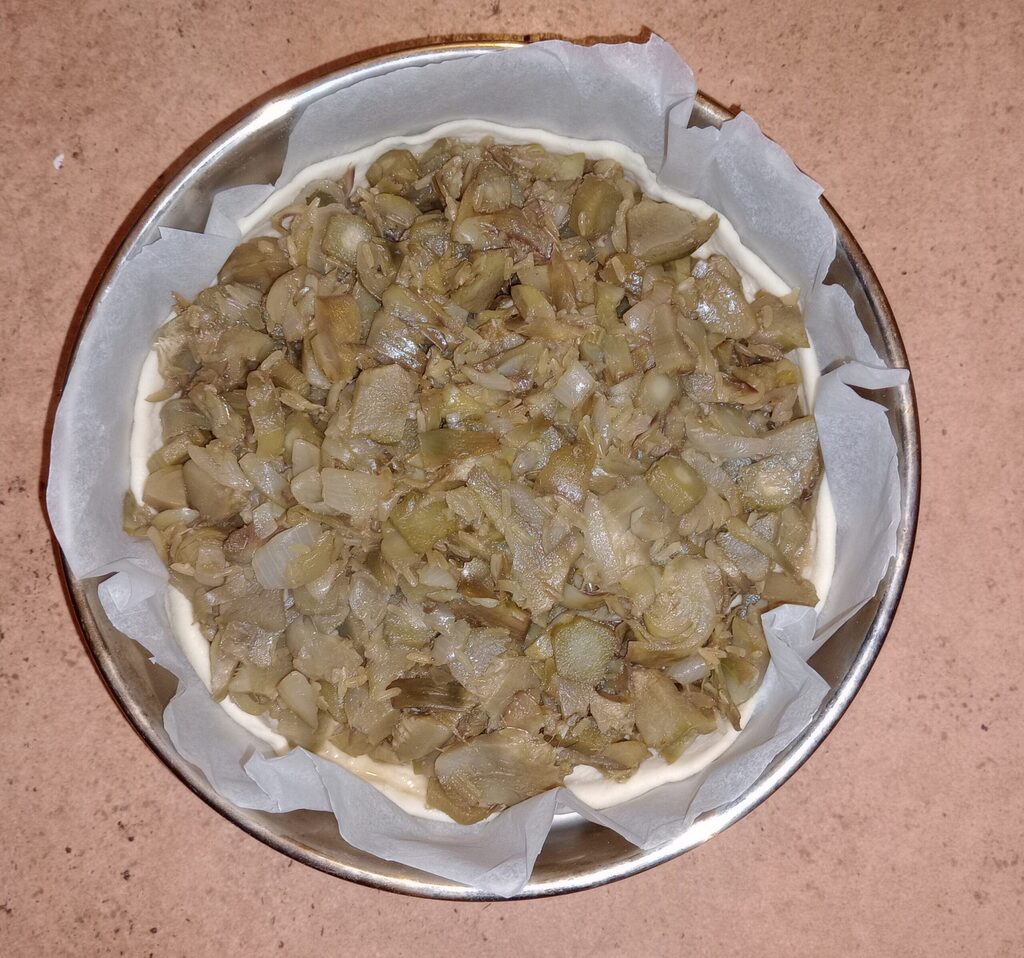 The artichoke rice pie is a typical savory pie prepared here in Liguria, and there are several versions: in the Levante area, it’s made without vegetables but with cheese, and there’s also a sweet version; in the Ponente area, vegetables like greens are used, and during Easter, artichokes are included.