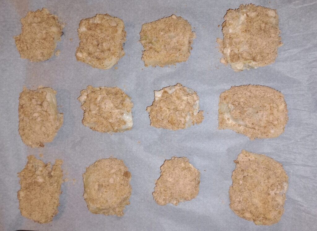 In this recipe, I did not use eggs and instead prepared a batter with water and flour, then passed them through breadcrumbs.