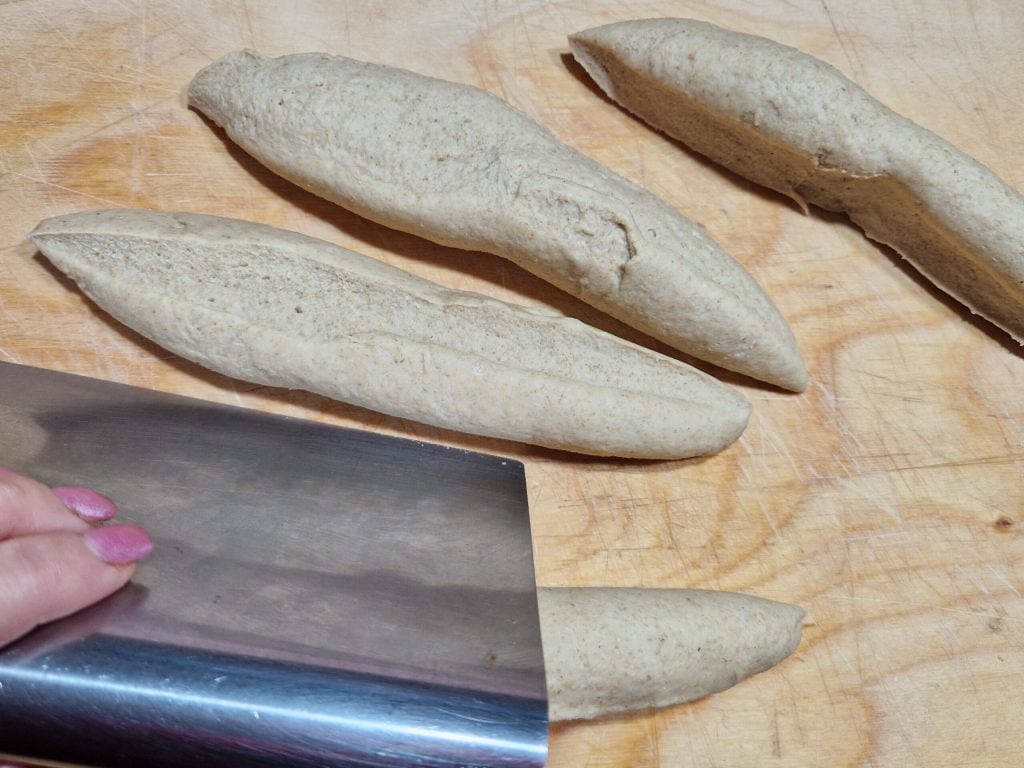With the rolling pin, slightly flatten the dough and then cut sticks with the pasta cutter.