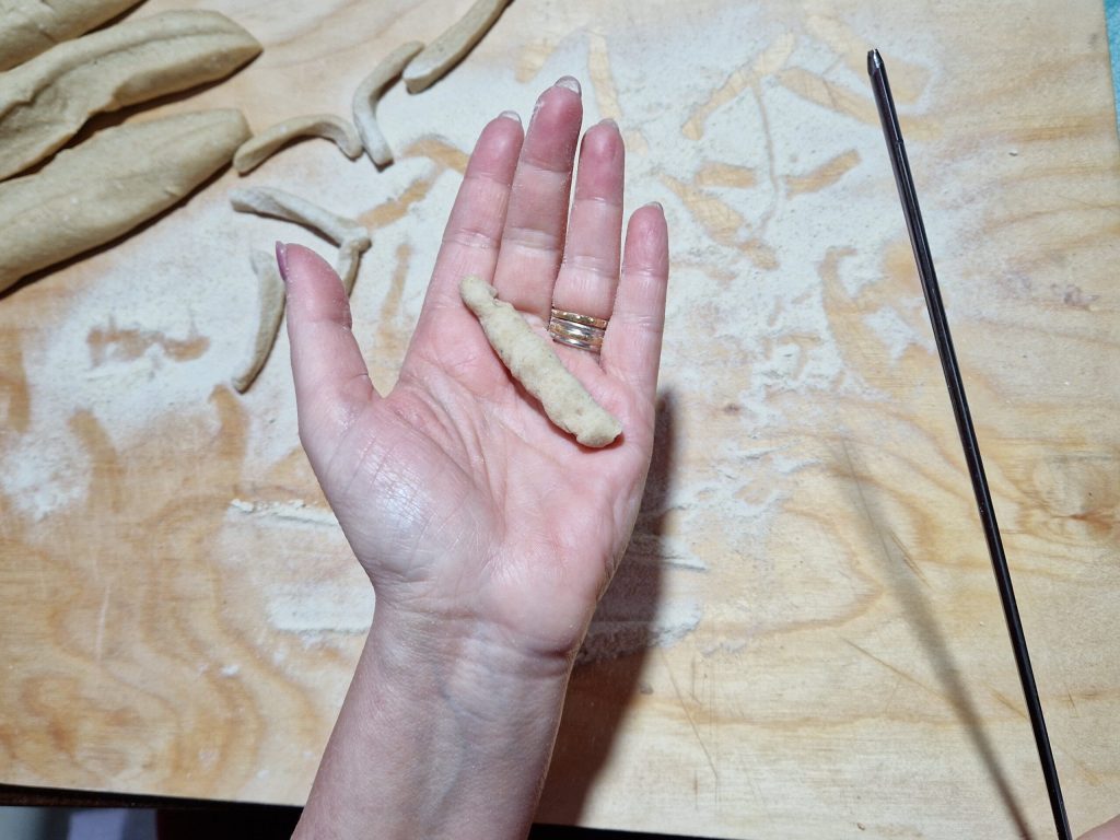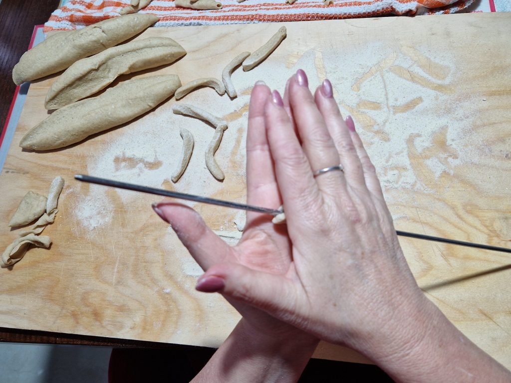 They are distinguished by their elongated and twisted shape, traditionally obtained by rolling small pieces of dough around a thin stem of buso, a local reed.