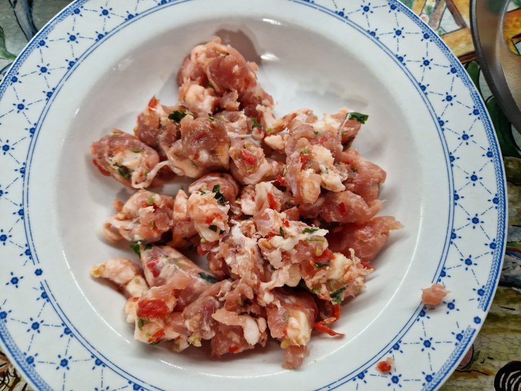 The size of the sausage varies, the thin and long ones braided in pairs and tied with the same casing, or the classic sausage links tied with string.