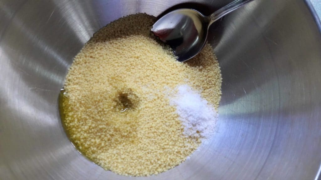 In a bowl, put the couscous, add 1 tablespoon of EVO oil and a pinch of salt, and mix well.