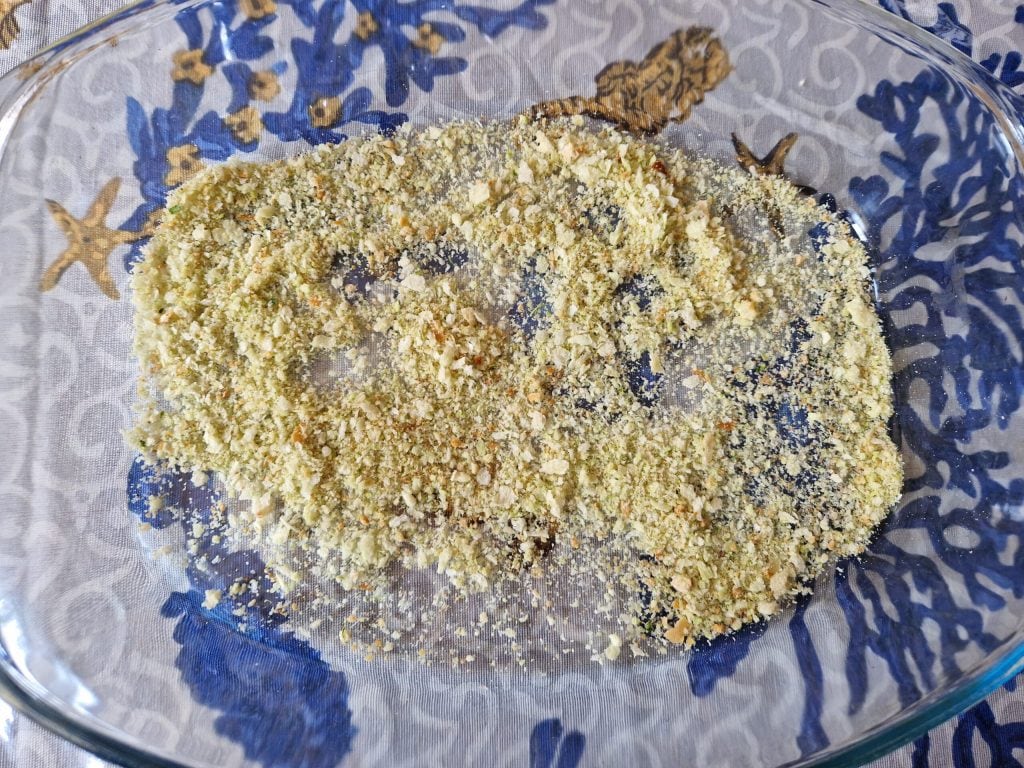In a baking dish with high sides, spread 1 tablespoon of Sicilian style seasoned breadcrumbs,