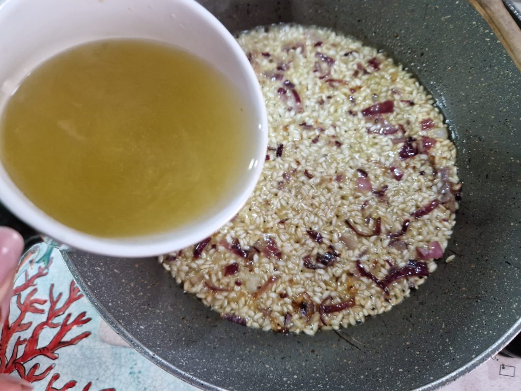 To obtain the right creaminess, in the final minute turn off the heat, add the butter and the Parmesan and quickly toss the risotto until it becomes silky (mantecato).