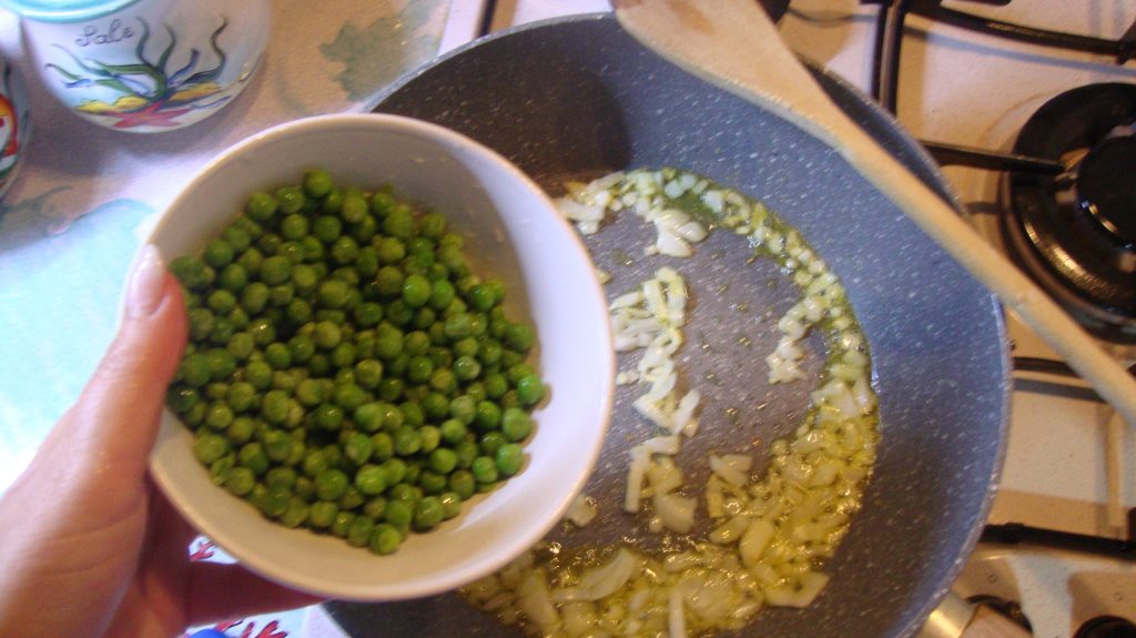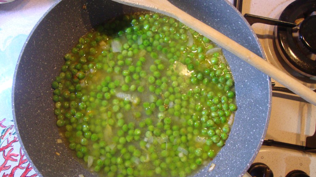 • Then add the peas, if using frozen ones, thaw them first, and stir.
