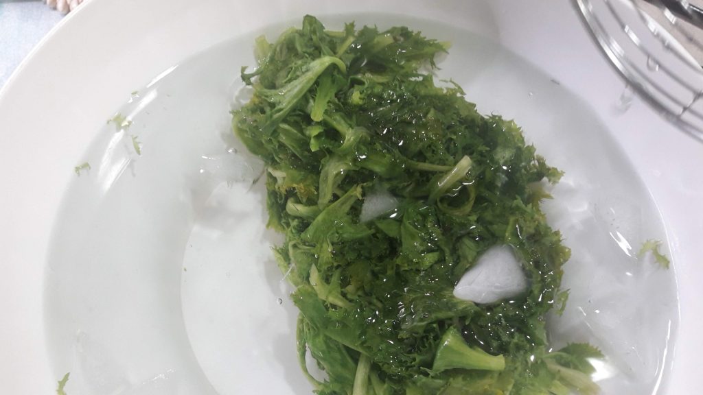 Wash the curly endive very well, I recommend filling the sink and, without cutting it, move it up and down several times, changing the water until it’s clean. Then remove the final part.