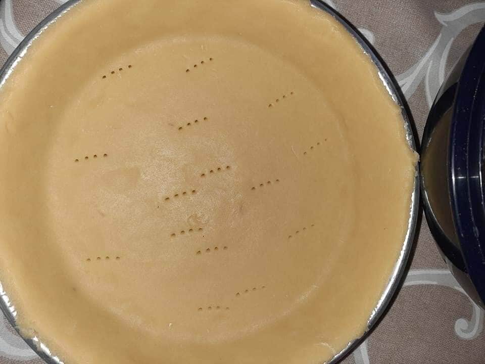 Poke the base with a fork, then pour the cold custard from the fridge inside, and level it.