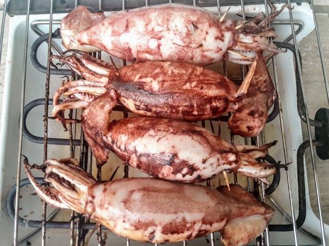 Turn on the grill, and as soon as it is hot enough, place the squid on top, cooking them for 5 minutes on each side.