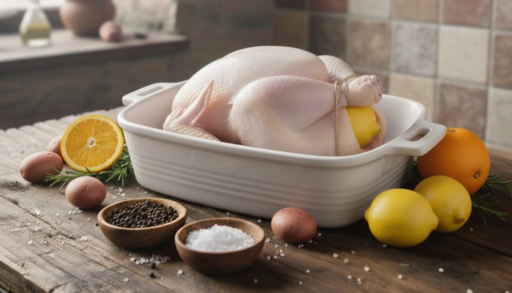 • Transfer the capon or chicken into a baking dish that must be the right size to contain it, neither too big nor too small.