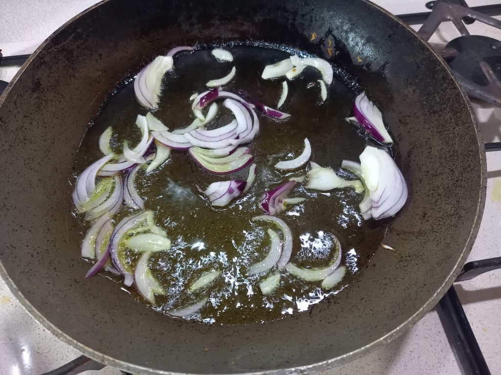 Always recover the drained oil, and place the onion in the non-stick pan with the extra virgin olive oil, and sauté for 3 minutes.