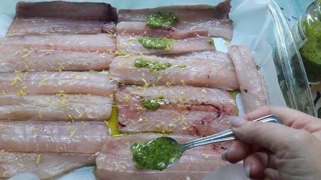 Place the fish fillets with the silvery side down. Grate half of the lemon zest, being careful not to grate the white part.
