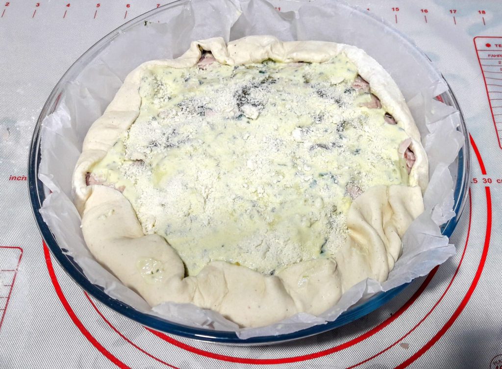Pour the ricotta and egg mixture, and fold over the excess edges of the brisè dough.