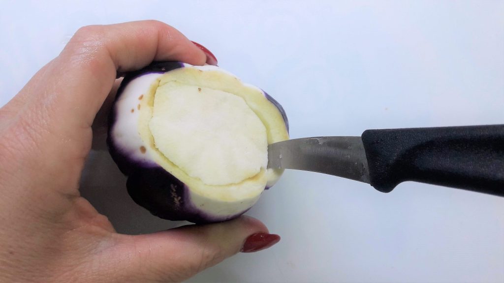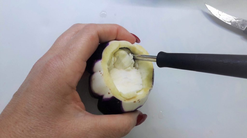 Now proceed: take one eggplant in your hand, and with a melon baller or a small spoon, scoop it out, taking care not to pierce it