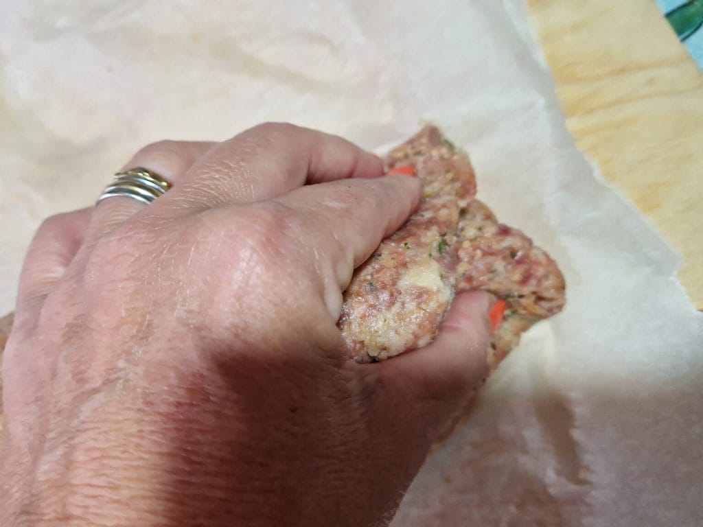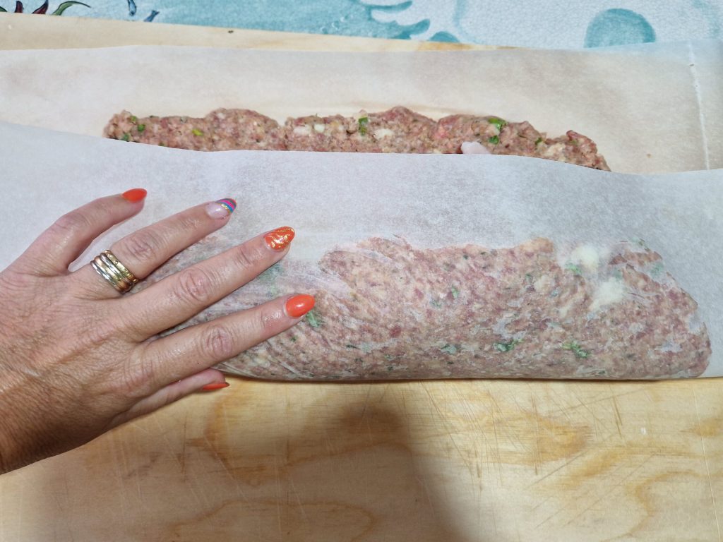 Sprinkle with the herbs, and with the help of the parchment paper roll up the meatloaf