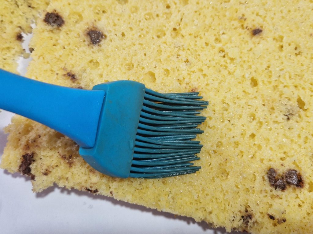• Remove the sponge cake from its pan and make cuts to shape it into a square as in the photo. (Yes, I know I could have baked it square, but for that amount my pan was too large so I opted for a round one.) We used the scraps to decorate the zuppette and for breakfast.