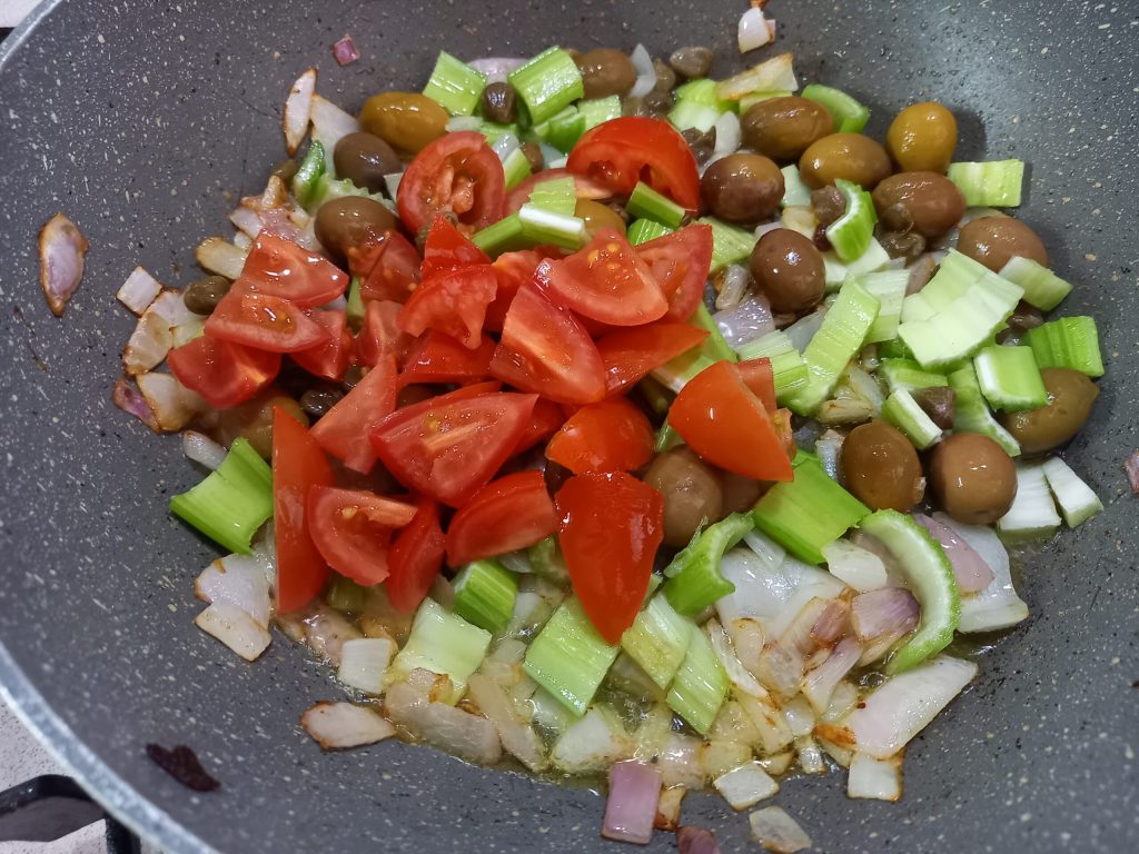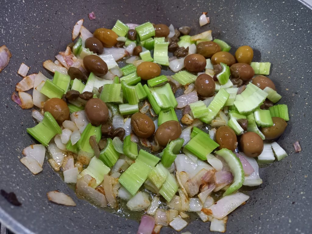 • Add the capers, green olives, all while the onion fries, and the chopped celery.