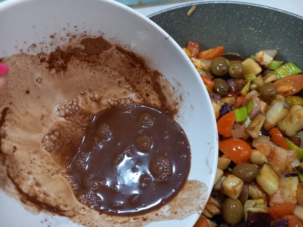 • Add the sugar or sweetener, 1 teaspoon of salt, the olives, the capers, the vinegar, 1 teaspoon of unsweetened cocoa, the chopped tomatoes, the tomato puree, and the basil.