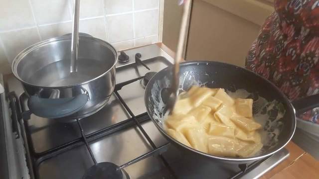 First, immediately put the water for the pasta, add the salt and bring it to a boil.