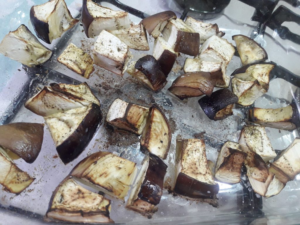 When the eggplants are cooked, take them out of the oven while you continue the preparation.