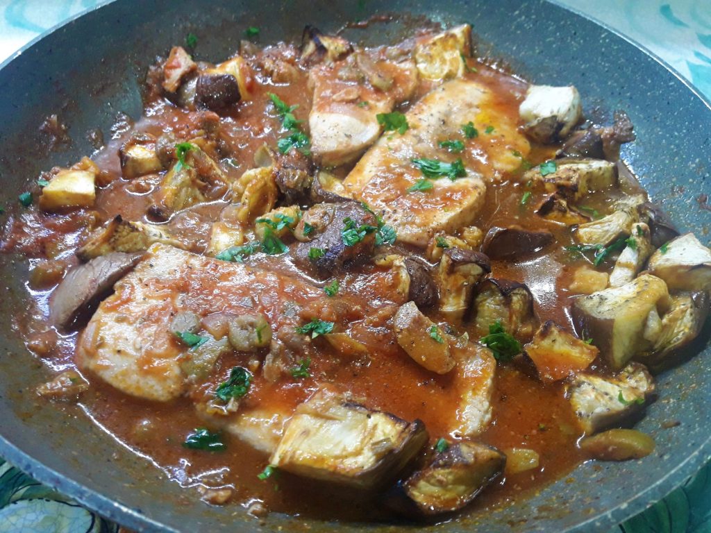 Pan-Seared Swordfish and Eggplants. An excellent light and flavorful main course that can be prepared quickly, transporting you to Sicily in a flash, even if you live in Piedmont.