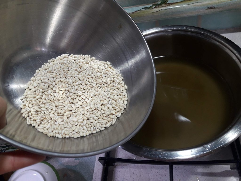 Put another pot with lightly salted vegetable broth on the stove, pour the barley in cold, and cook for 3/4 of the time written on its package.