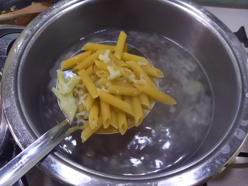 Put the pot with the cauliflower water on the stove, and if necessary add more, you will cook the pasta there.