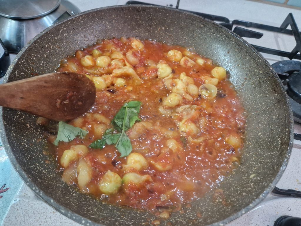 Cook for about 3 minutes then pour 100 g of tomato sauce, salt, and basil and let it cook for about 5 minutes.