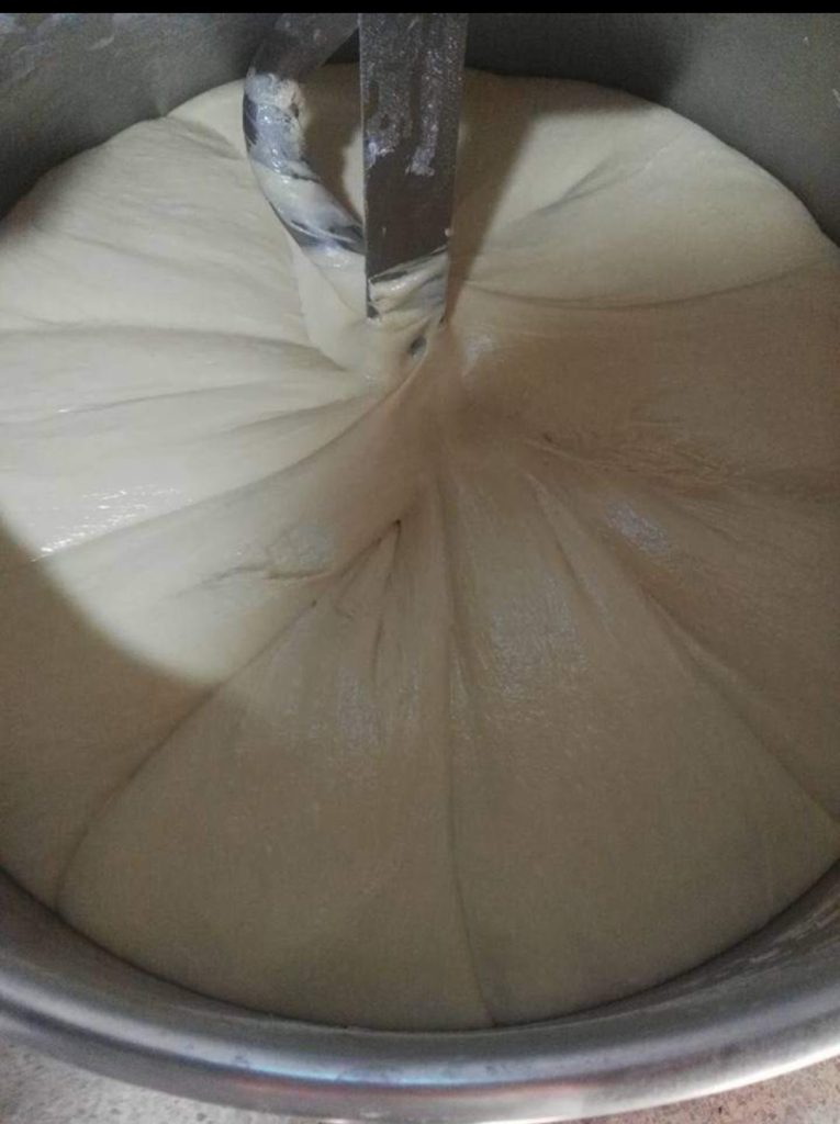 After the time is up, turn off the machine, remove the paddle, and attach the hook, restart the machine at medium speed while adding the butter in pieces.