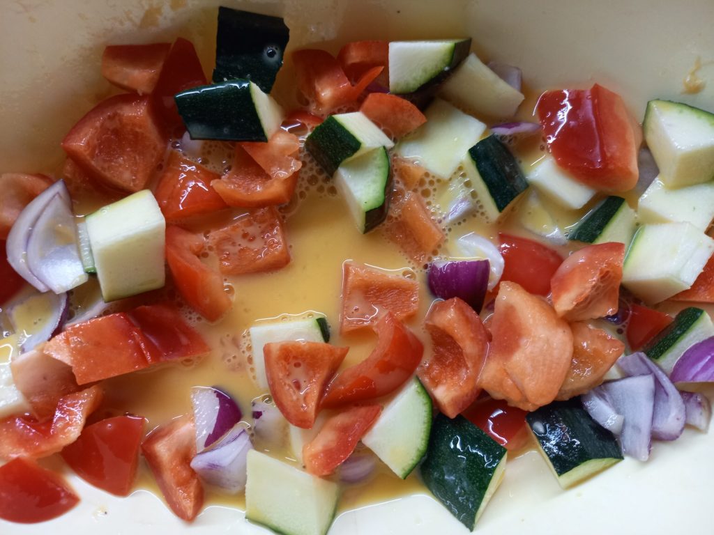 • A tip I want to give you: since I had leftover egg and breadcrumbs, I made some skewers with the vegetables I had in the fridge.