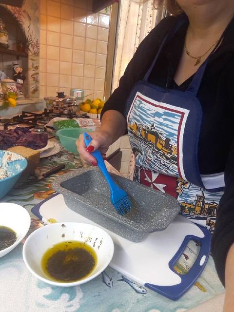 Cut the cherry tomatoes into pieces (leave some for the final decoration), and season with extra virgin olive oil, salt, and pepper. Add them and continue to fill the pan until you have used up all the ingredients, finishing with a layer of Pan bauletto. Refrigerate for at least 1 hour.