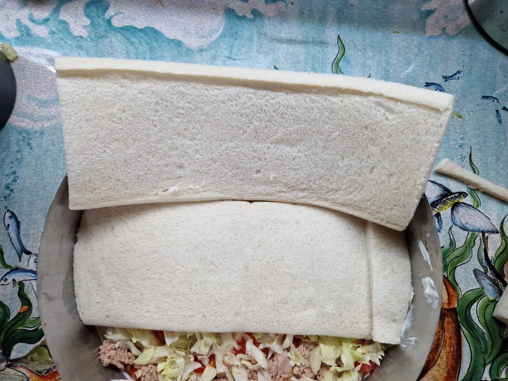 It has a salty biscuit base made with crackers and butter, scented with roast seasoning, two layers with white bread or sandwich bread, all filled with tuna and vegetables.