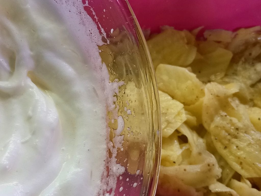 • As soon as the egg whites are whipped, add them to the potato slices and mix everything very gently.