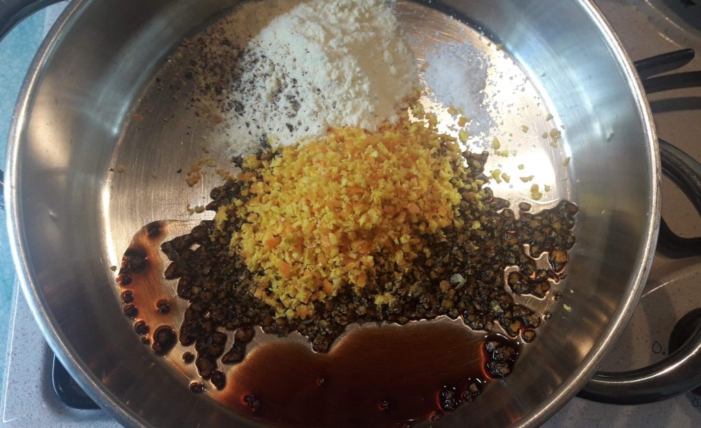 In a small pan add the flour, soy sauce, chopped tangerine peel, a pinch of pepper.