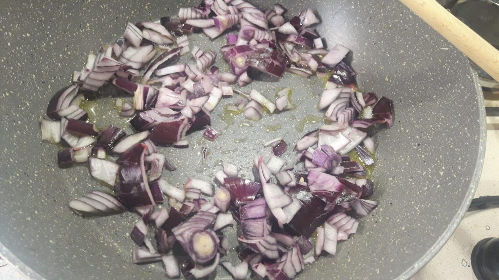 Peel the onion and chop it, place it in a non-stick pan with the olive oil, and sauté for 2 minutes.