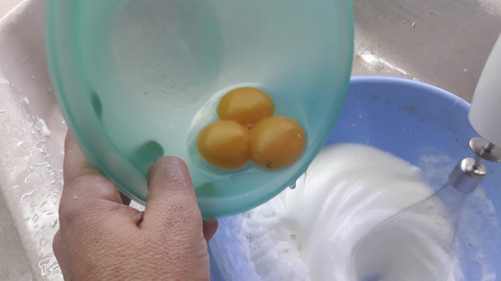 Once whipped, place it in the fridge and in the meantime, separate the yolks from the whites.