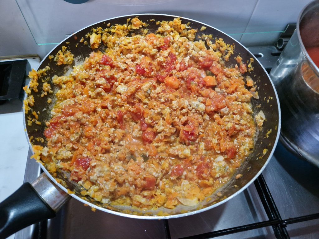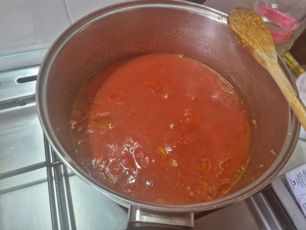 • Then add the peas and tomato sauce, adjust salt and pepper, and let it cook for about 20 minutes