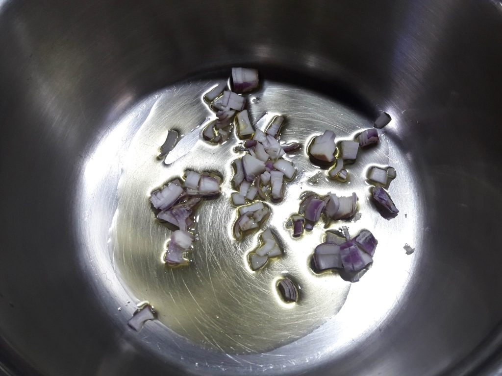 Peel the onion and garlic and chop them finely. Sauté them with the 2 tablespoons of extra virgin olive oil for about 2 minutes.