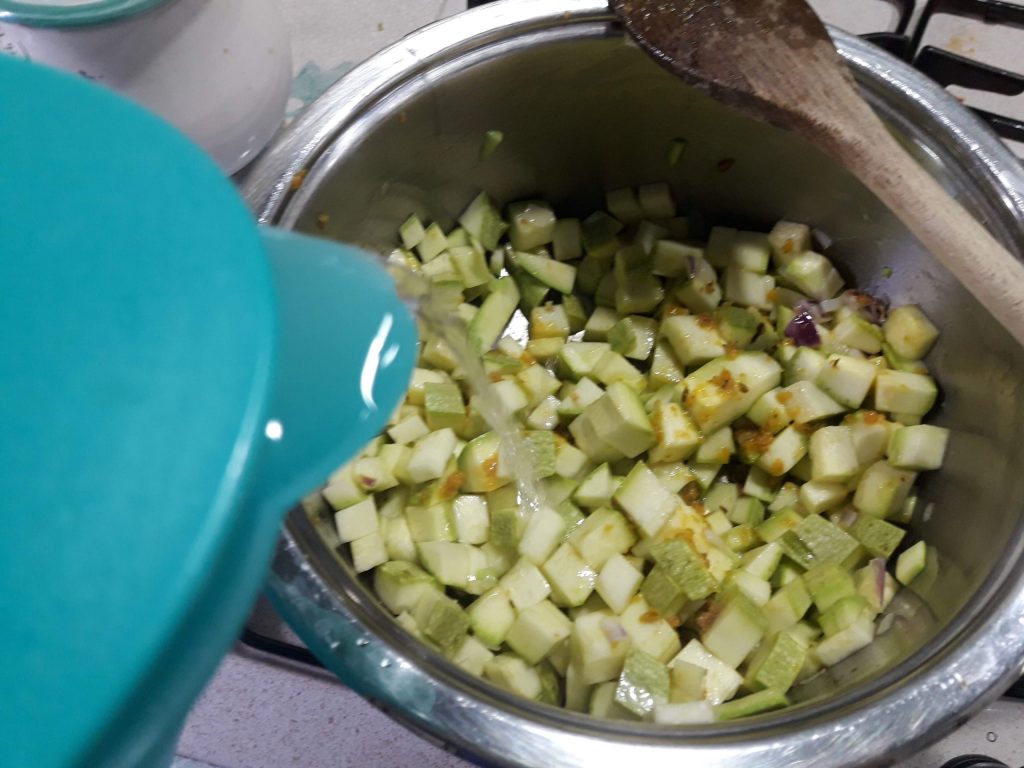 When the garlic and onion are golden, add the zucchini cubes, the broth cube,